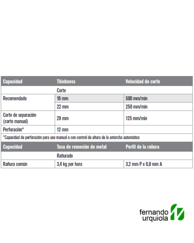 El Powermax45® XP es un sistema de plasma profesional de 45 A para corte, ranurado y marcado, con capacidad de corte recomendada hasta 16 mm, corte de separación hasta 29 mm y perforación hasta 12 mm. Se destacó por su portabilidad, facilidad de uso y alto rendimiento, ofreciendo velocidades de corte superiores al oxicorte y una excelente calidad de acabado, con menos retrabajos.